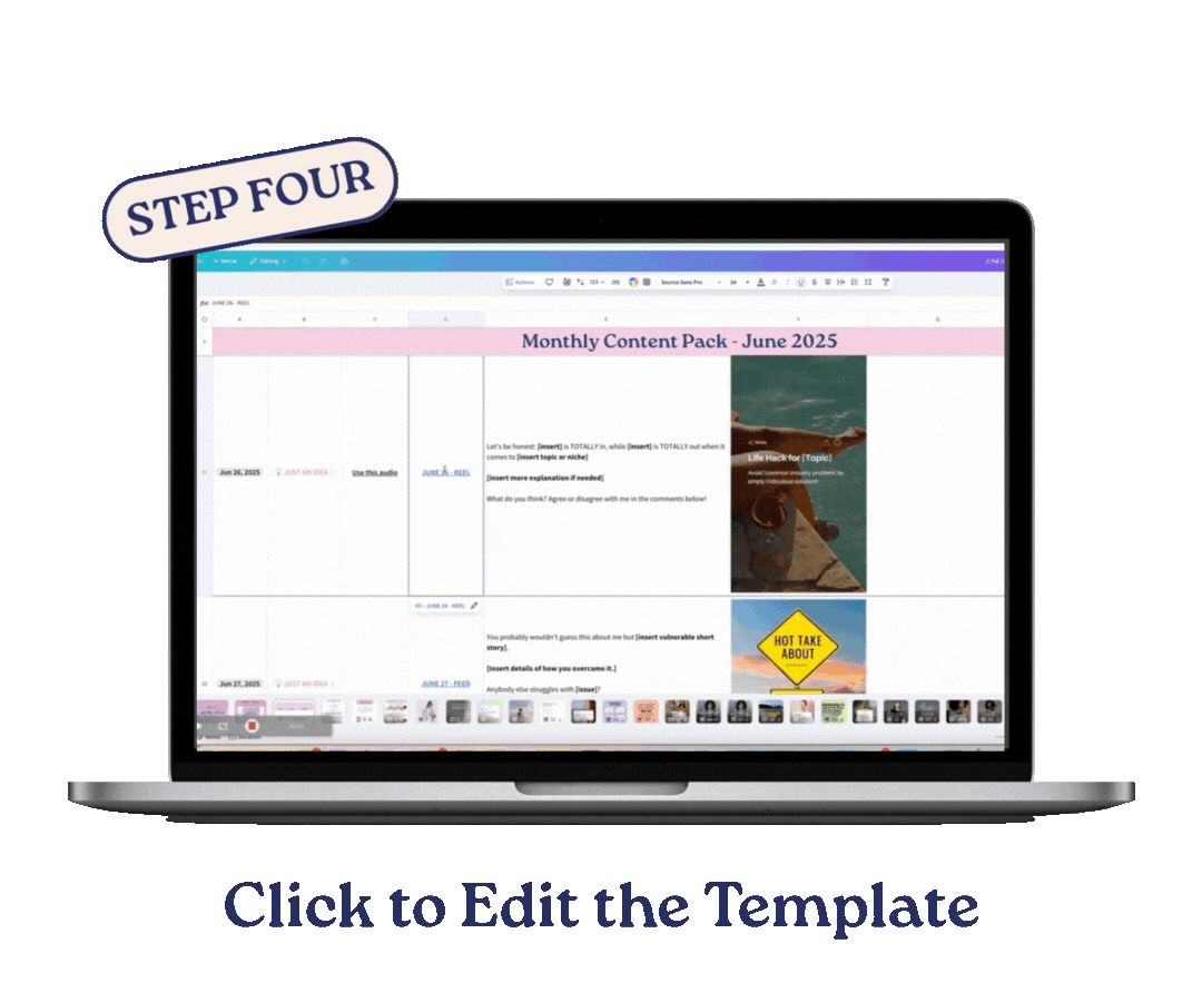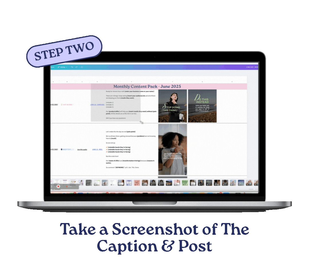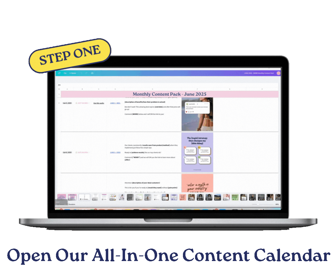 Each month we deliver a new content pack for the whole month of posts, Carousels, Reels with audio links, Captions and Stories, that you can batch in 2 hours or open on your phone for the post of the day!
